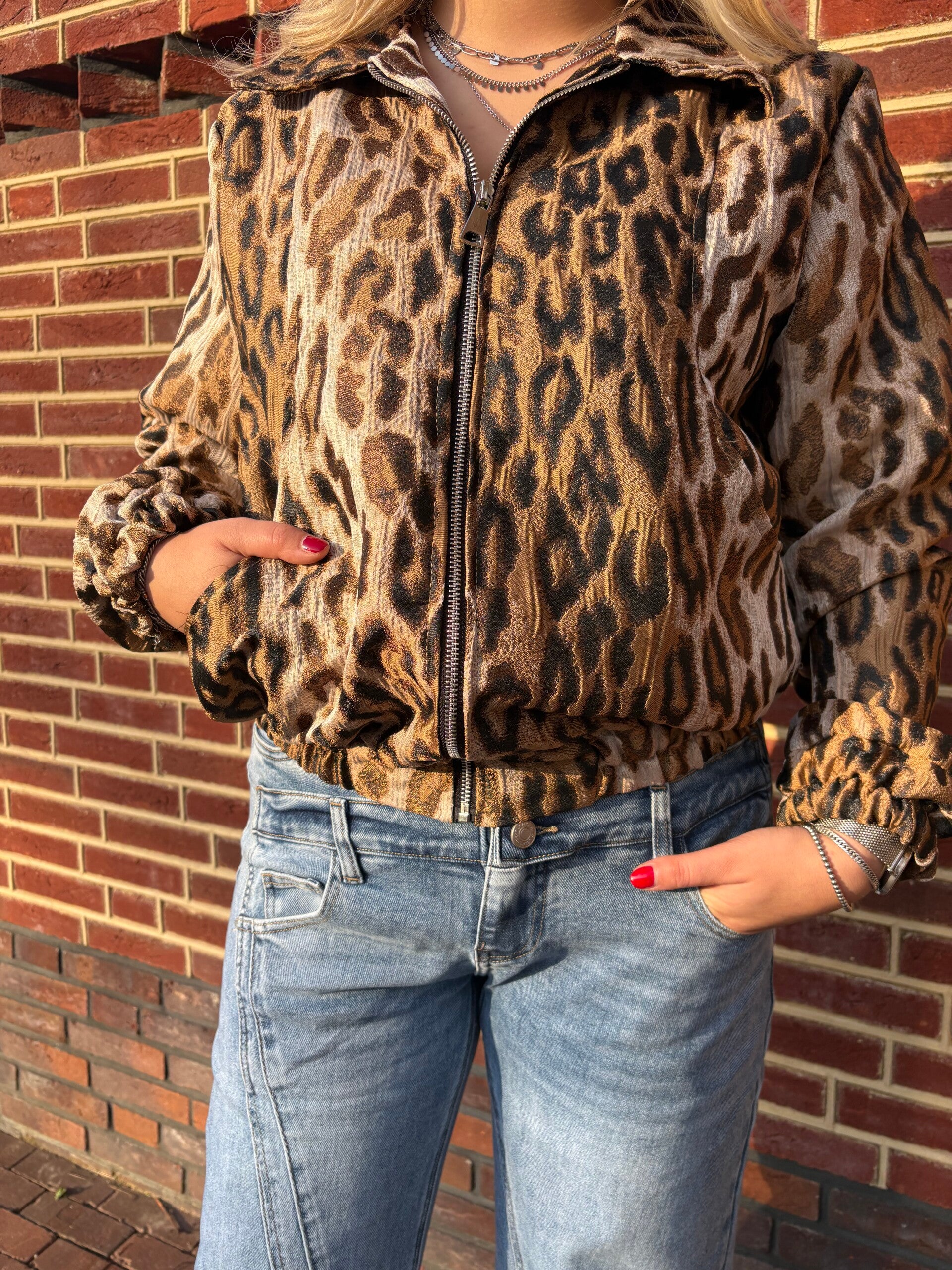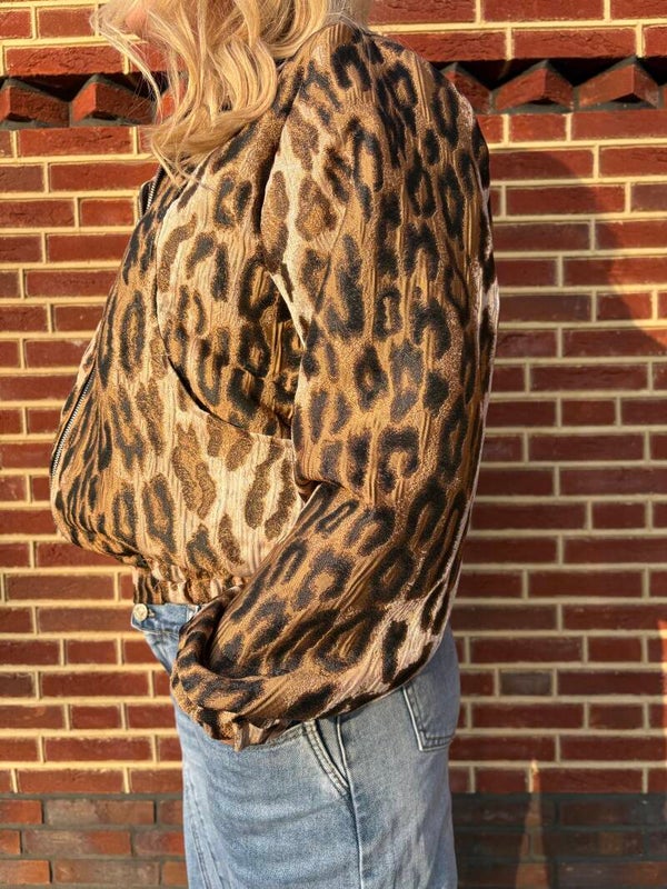 Glanzend, zacht en net een tikkeltje decadent – deze cropped bomberjack schreeuwt “ik ben hier om te shinen” zonder een woord te zeggen. De klassieke bomber-vorm met elastische boorden, slouchy mouwen met die mooie ruches en die dikke rits die alles afmaakt. De luipaardprint is warm bruin/goud met die typische zwarte vlekken die je outfit instant wild maken.
