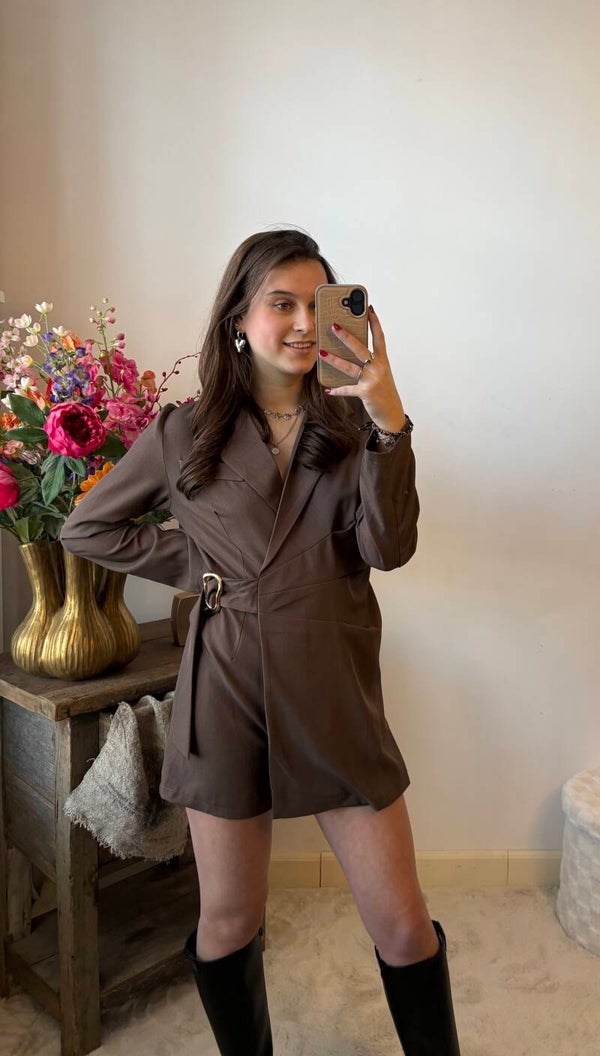 De Emie is dat perfecte oversized blazer-meets-mini-shorts jumpsuit met die dramatische lange mouwen, scherpe revers en een mega flatterende wrap-front met statement D-ring belt. Beschikbaar in diep zwart (klassiek & edgy) én rijk chocoladebruin (warm, luxe & super verslavend).