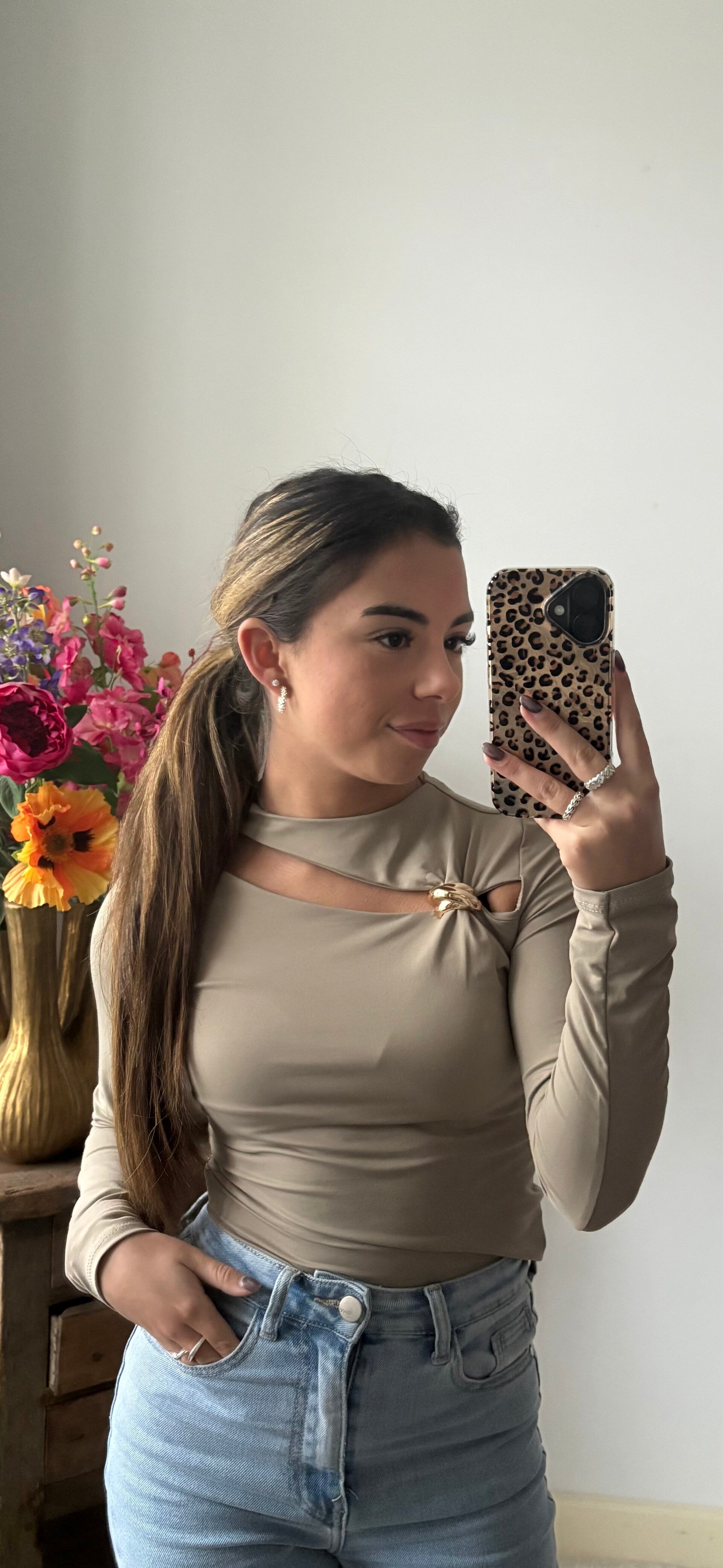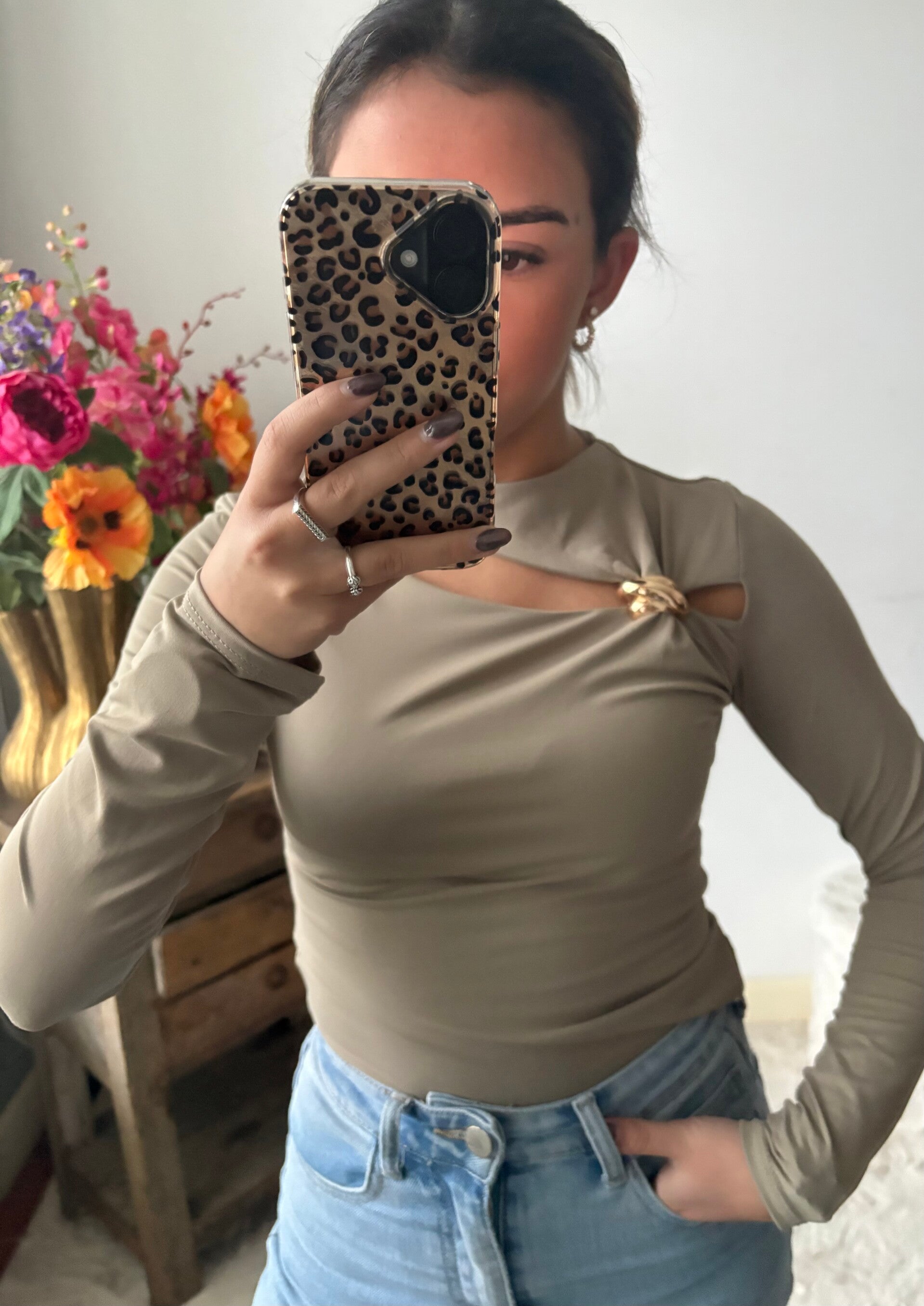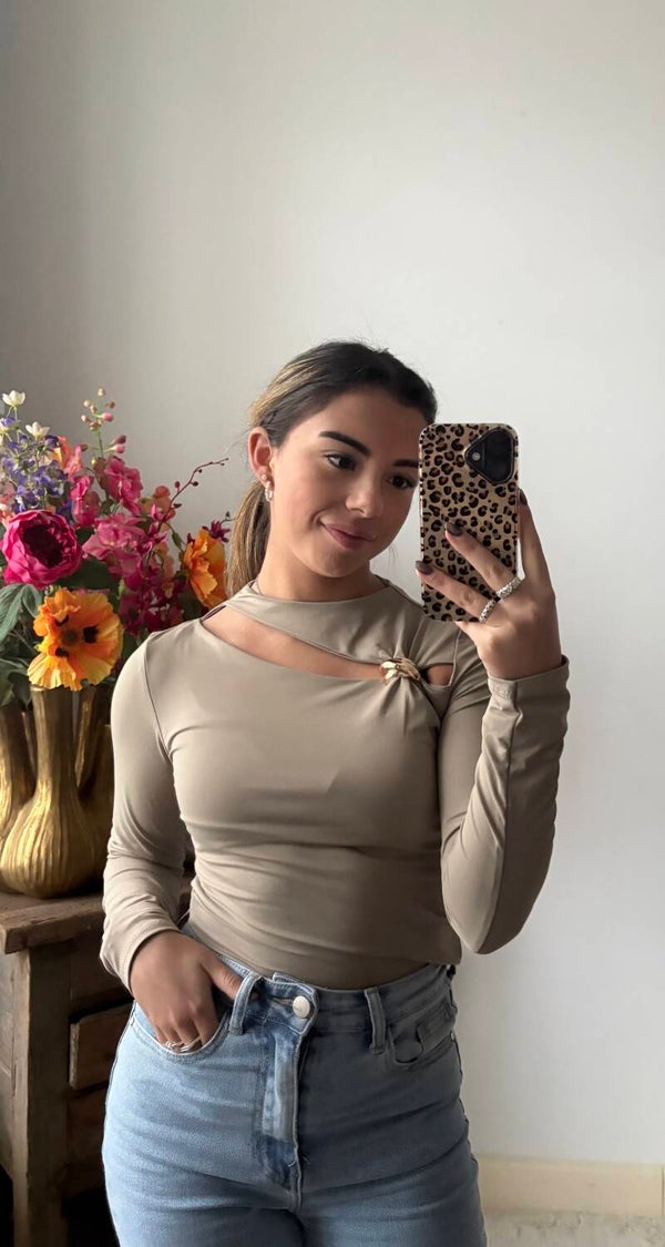 Say hello to je nieuwe everyday hero die stiekem allesbehalve basic is. Deze ultra-flatterende long-sleeve top in zachte taupe heeft precies de juiste dosis attitude: een sexy cut-out met die gouden knoop-detail die je taille subtiel accentueert en net genoeg skin laat zien om je zelfverzekerd te laten voelen – zonder dat het té wordt.